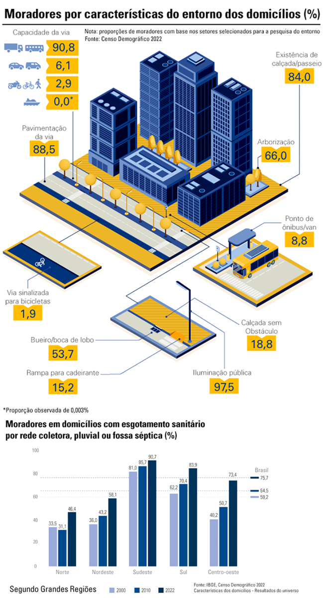 “O problema é ainda mais grave, já que muitas moradias existentes se encontram em terrenos impróprios ou sofrem com algum tipo de inadequação, como ruas sem calçadas, pavimentação ou drenagem, com esgoto a céu aberto”, aponta o arquiteto e urbanista Luiz Firmino Martins Pereira, pesquisador do Centro de Estudos em Regulação e Infraestrutura (CERI), da FGV (veja abaixo dados do Censo 2022).
