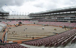 Diferente de outros estádios, os engenheiros da Arena Pernambuco optaram por instalar os módulos da cobertura já prontos, com acabamento. Essa instalação já está em sua etapa final.