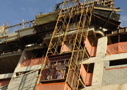 Além disso, determina que sejam consideradas as cargas mortas (estáticas e dinâmicas), a carga do vento em serviço e em posição fora de serviço e na montagem e desmontagem do elevador, sem considerar a carga transportada em função da área da cabina.