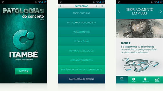 Gratuito, o suporte tecnológico pode ser baixado diretamente do site da Itambé (http://www.cimentoitambe.com.br/aplicativos/) e ajuda os profissionais que atuam nos canteiros de obras a diagnosticar patologias como corrosão de armaduras, desplacamento em pisos, eflorescências, esfarelamento do concreto,