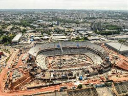 A arena tem três frentes de trabalhos: a montagem dos pré-moldados das arquibancadas, a instalação da parte hidráulica dos camarotes e o lançamento das lajes dos meios de serviço da ala oeste. A conclusão da arquibancada inferior está prevista para abril. Depois, nos seis meses s
