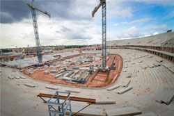 A 12 meses da entrega total das obras, a Arena da Amazônia está com 50,6% executada. Os trabalhos seguem em andamento com a montagem dos degraus da arquibancada superior no setor leste, além da construção dos banheiros, camarotes e pódio.