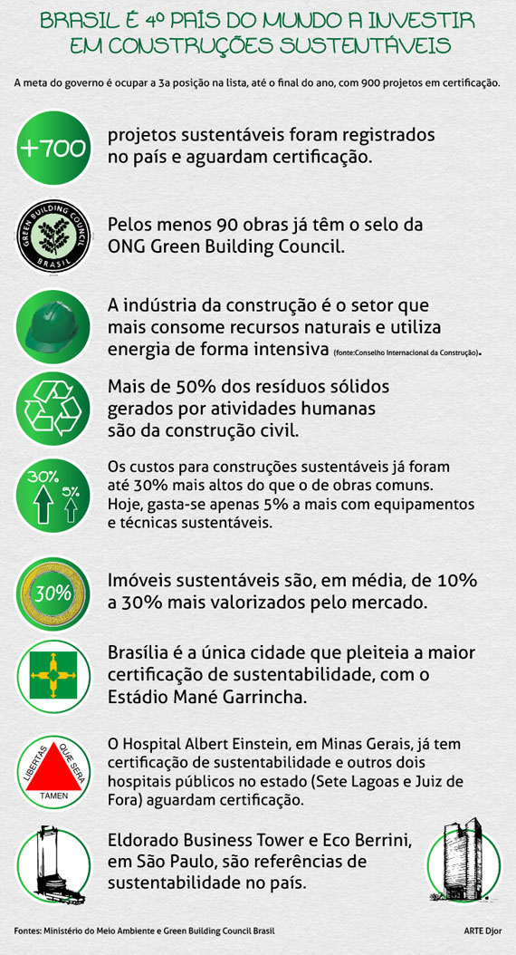 Mais de 720 projetos brasileiros aguardavam a certificação internacional, conferida pela organização não governamental internacional chamada Green Building Council (GBC), responsável por estimular as construções verdes no mundo. Pelo menos 99 edificações no país detêm o selo. A expectativa do governo e da indústria de construção é chegar a 900 projetos para análise da organização até o final do ano.