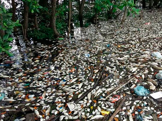 Peixes apareceram mortos durante o incêndio que atingiu a Alemoa (Foto: Robynson Señoraes / G1)