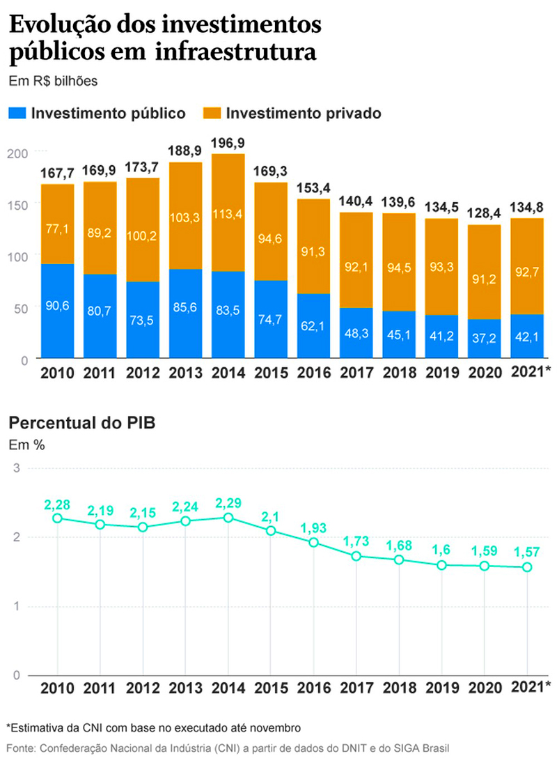 O indicador atingiu o menor valor da série histórica em 2021 e vem caindo desde 2014, quando era de 2,29%. Segundo o estudo da CNI, o Brasil investe hoje cerca de R$ 135 bilhões no setor, mas especialistas estimam que seria preciso aportar mais R$ 200 bilhões por ano por um prazo superior a uma década para manter o que já existe e ampliar a infraestrutura. Ou seja, é necessário mais que dobrar os recursos.