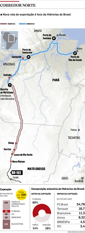 Corredor norte. O presidente da Hidrovias do Brasil, Bruno Serapião, afirma que 80% do dinheiro captado será investido no corredor dos rios Tapajós-Amazonas, entre a cidade de Miritituba e o Porto de Vila do Conde, no Pará. A chamada saída pelo Norte virou o grande negócio das empresas de logística com o estrangulamento dos portos do Sul e Sudeste do País. Com os maiores produtores de grãos instalados no norte de Mato Grosso, a saída natural virou os portos do Norte.