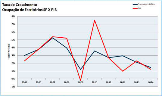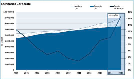 Segundo Alves, ao projetar a taxa de ocupação dos escritórios com base na variação do PIB prevista para 2014 e 2015 e, paralelamente, estimar o novo estoque com base na atividade construtiva atual, considerando a data de entrega prevista para 2014 e 2015, percebe-se uma forte tendência no aumento da taxa de vacância no mercado de escritórios de São Paulo. Neste contexto, conforme demonstram os gráficos abaixo, os escritórios Corporate passariam de cerca de 10% no início de 2014 para 16% de taxa de vacância no final de 2015, uma variação de 6 pontos percentuais em 24 meses.