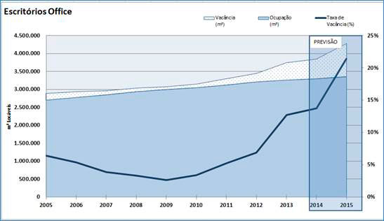 Já os escritórios Office, conforme ele, passariam de 13% no início de 2014 para mais de 21% de taxa de vacância no final de 2015, o que pode representar quase 1 milhão de metros quadrados Office desocupados.