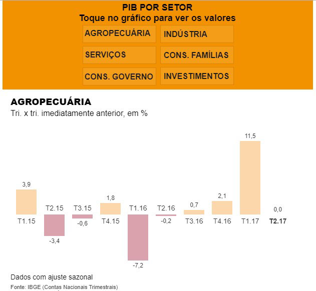A agropecuária ficou no zero no segundo trimestre, efeito já esperado após a expansão forte no início do ano. Nos próximos meses, os efeitos da safra recorde de grãos vão se dissipar e não ajudarão mais a empurrar o PIB.