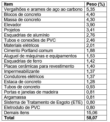 Entre os materiais, sobressaem-se itens estruturais à base de cimento e concreto — massa de concreto, blocos de concreto e cimento Portland comum — e os vergalhões e arames de aço ao carbono, que isoladamente respondem por quase 6% da ponderação total.