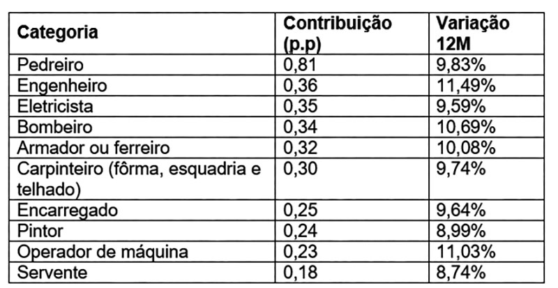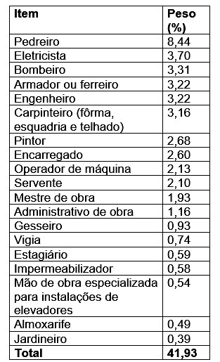 Já do lado da mão de obra, o peso se distribui entre funções técnicas e especializadas, com destaque para pedreiros, eletricistas e bombeiros, que juntos representam cerca de 15% do índice.