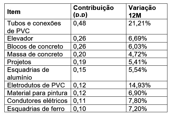 O custo com os materiais e equipamentos registrou aceleração relativamente a 2024. Itens como tubos, conexões e eletrodutos de PVC, e vidros, por exemplo, que em 12 meses subiram 21,2%, 14,2% e 13,9%, nessa ordem, mostram que há bolsões de pressão também do lado dos insumos.