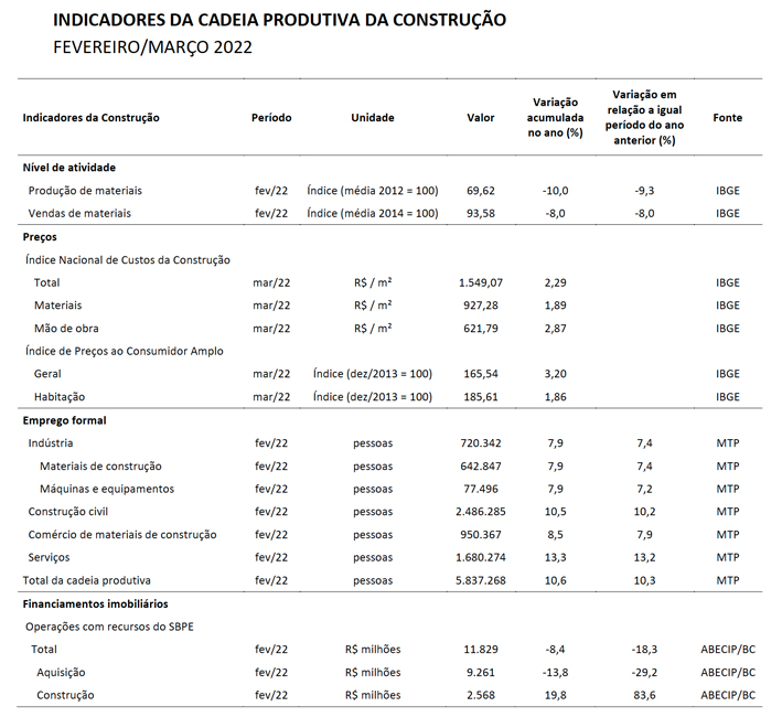 Vale notar que o crescimento interanual elevado observado no segundo semestre de 2021 reflete (i) a recuperação do nível de ocupação da cadeia em relação a 2020, período em que os efeitos das medidas de combate à disseminação da pandemia da covid-19 no país foram mais intensos sobre a atividade econômica; e (ii) o efeito base, com o nível do pessoal ocupado mais deprimido em 2020. Por fim, cabe destacar que foram criados 546.536 postos de trabalho com carteira assinada em toda a cadeia produtiva da construção entre os meses de fevereiro de 2021 e fevereiro de 2022.