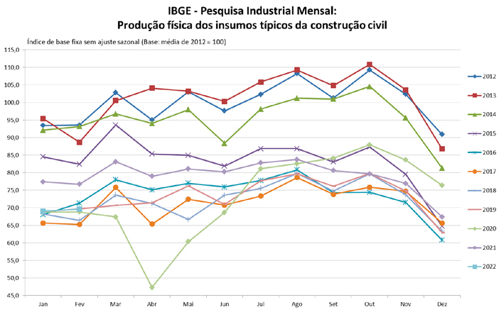 A produção industrial dos insumos típicos da construção civil voltou a ter desempenho negativo em fevereiro, na comparação com o mesmo mês do ano anterior, com uma queda de 9,3%, segundo a última Pesquisa Industrial Mensal (PIM) do IBGE. Esse é o sexto declínio consecutivo na base de comparação interanual. Como ilustra o primeiro gráfico a seguir, que traz o índice de produção desses bens a partir de 2012 sem ajuste sazonal, o patamar de produção do primeiro bimestre se manteve abaixo daquele registrado no mesmo período do ano passado, correspondendo a uma queda acumulada de 10,0% entre os bimestres.