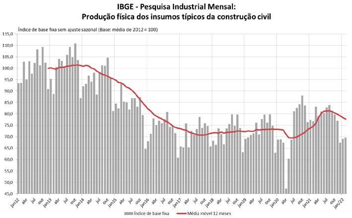 A produção industrial dos insumos típicos da construção civil voltou a ter desempenho negativo em fevereiro, na comparação com o mesmo mês do ano anterior, com uma queda de 9,3%, segundo a última Pesquisa Industrial Mensal (PIM) do IBGE. Esse é o sexto declínio consecutivo na base de comparação interanual. Como ilustra o primeiro gráfico a seguir, que traz o índice de produção desses bens a partir de 2012 sem ajuste sazonal, o patamar de produção do primeiro