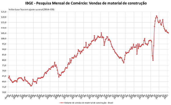 É possível notar que a trajetória de declínio mensal das vendas de materiais iniciou-se ainda em julho de 2021, interrompida pontualmente em novembro. Na comparação com fevereiro do ano passado, o desempenho foi igualmente negativo, com queda de 8,0%, oitava retração consecutiva nessa base de comparação. Nesse contexto, as vendas desses produtos já acumulam uma variação negativa de 8,0% no primeiro bimestre do ano frente ao mesmo período de 2021, contribuindo para a continuidade da desaceleração da taxa de variação acumulada nos últimos doze meses, que passou de 2,9% até janeiro para 1,0% até fevereiro.