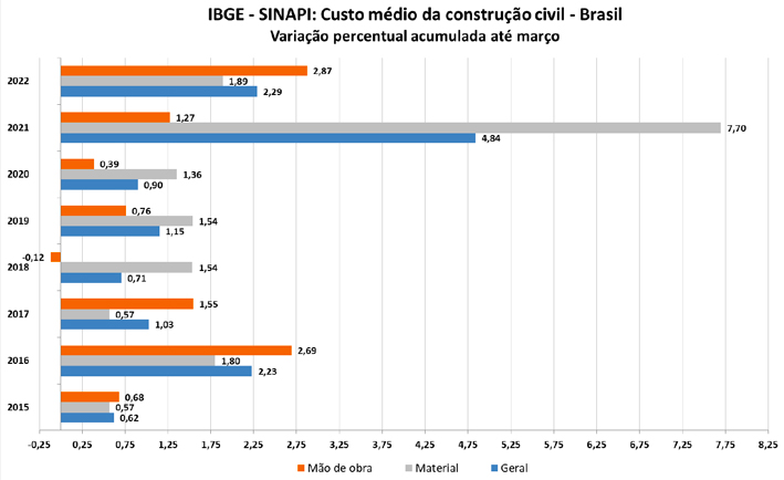 O custo médio nacional da construção, mensurado pelo Índice Nacional da Construção Civil do Sistema Nacional de Pesquisa de Custos e Índices da Construção Civil (Sinapi) do IBGE, subiu 0,99% em março em relação ao mês anterior, constituindo-se a maior taxa mensal do ano e a mais alta desde novembro de 2021, quando esses custos avançaram 1,07% no mês. Por outro lado, o resultado de março ficou abaixo da taxa apurada em idêntico mês do ano passado (1,45%). No acumulado do primeiro trimestre do ano, a expansão do custo médio atingiu 2,29%, inferior à variação observada no mesmo período de 2021 (4,84%), como mostra o gráfico abaixo, que compara, desde 2015, o resultado acumulado no ano até março.