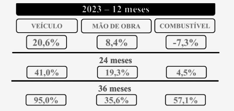 “O combustível, por exemplo, apesar de ter tido o seu preço reduzido em 7,3% em média no último ano, acumula um aumento de 57% nos últimos 3 anos, sendo que o preço dos caminhões teve um reajuste médio de 95% no mesmo período”, complementa.