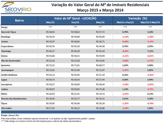 Apesar de não ter apresentado um número mínimo no aluguel, Bangu foi o bairro que registrou a maior alta em relação a março de 2014, 29,25%, seguido do Centro da cidade, com 8,16%. Recreio foi o bairro com maior procura em comparação a fevereiro, 5,5%.