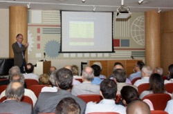 A palestra do professor Luiz Martins de Miranda foi marcada por exemplos do risco apresentado pela oxidação. Luiz, que é especialista da área, analisou os pontos da agressividade química que rodeiam a estrutura de concreto armado. Ele explicou que, se o grau de deterioração do concreto armado for muito grande, não seja possível salvar a construção. “Um exemplo foi o viaduto Faria Timbó, que desabou por problemas parecidos e levei meus alunos para estudarem peças da obra”, narrou. O professor ressaltou que é essencial medir e acompanhar as medidas de corrosão. Segundo ele, não há nenhum cálculo que possa prever esse grau, não há forma de normatização como acontece com degradação comum de estruturas. Para ele, o monitoramento deve ser feito com técnicas eletroquímicas que já existem, são fáceis e relativamente baratas.