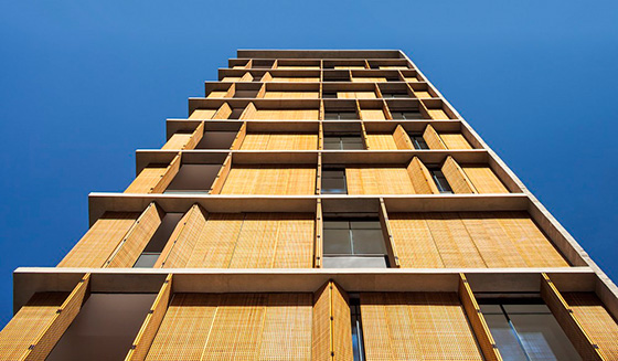 Outro diferencial é a fachada do edifício, composta de painéis expostos de concreto e de madeira reforçada, que foi concebida para diminuir a entrada de claridade dentro dos apartamentos. Dessa forma, o usuário pode controlar a incidência de luz em cada unidade de acordo com sua preferência, aumentando o conforto.