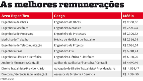 Engenharia civil é a área com melhores salários em Fortaleza, segundo pesquisa realizada pela empresa Catho, site brasileiro de classificados de currículos e vagas de emprego. A média salarial do cargo é de R$ 9.100,80. Entre os dez postos de trabalho melhor colocados no ranking da Catho, a engenharia destaca-se em seis deles. O estudo, realizado trimestralmente pela empresa, busca traçar um panorama das demandas atuais do mercado d