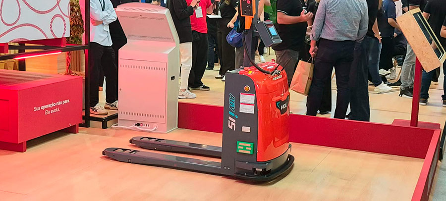 Empilhadeiras autônomas foram o principal destaque da Heli Brasil na feira. Imagem: MARCELO J
