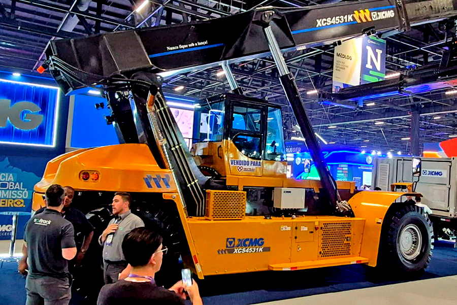 Em manipuladores de contêiner cheio, o carro-chefe da linha é o modelo XCS4531K, exposto na Intermodal 2026 e capaz de empilhar até cinco contêineres na primeira e na segunda fileiras.