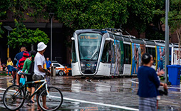 O VLT, com sua modernidade e tecnologia, é o mais novo integrante de uma já tumultuada paisagem onde estão ônibus, carros, motos, bicicletas e pedestres.