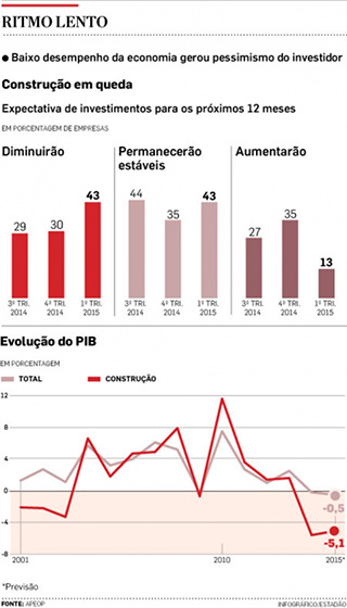 A crise de confiança que se abateu sobre o Brasil com o baixo desempenho da economia, manobras fiscais do governo federal e a Operação Lava Jato derrubou a perspectiva de investimento do setor de construção civil nos próximos meses. Uma pesquisa feita pela consultoria GO Associados a pedido da Associação Paulista de Obras Públicas (Apeop) mostra que 43% das empresas do setor vão cortar investimentos nos próximos 12 meses e outras 43% vão se manter no patamar atual.