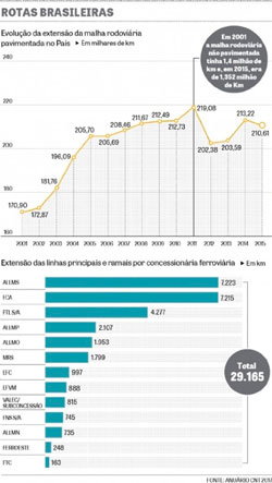 Embora a venda de veículos tenha sofrido nos últimos dois anos, por conta da crise econômica, na comparação entre 2001 a 2016, a frota de automóveis no Brasil cresceu 141,6%, a de ônibus 113,5% e a de caminhões 84,3%. Na mesma base, a malha rodoviária passou de 1,74 milhão de quilômetros para 1,72 milhão. Nos trechos pavimentados, o volume foi de 170,9 mil quilômetros para 210,6 mil quilômetros.