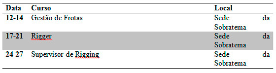 O Instituto Opus da Sobratema – Associação Brasileira de Tecnologia para Construção e Mineração promoverá no mês de novembro três cursos de capacitação na área de equipamentos para construção e mineração. Entre os cursos a serem realizado estão: Rigger, Supervisão de Rigging, e Gestão de Frotas.
