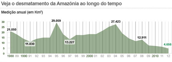 De acordo com dados do Prodes, entre agosto de 2011 e julho de 2012 houve a perda de 4.656 km² de floresta, área equivalente a mais de três vezes o tamanho da cidade São Paulo. O índice é 27% menor que o total registrado no período entre agosto de 2010 e julho de 2011 (6.418 km²).
