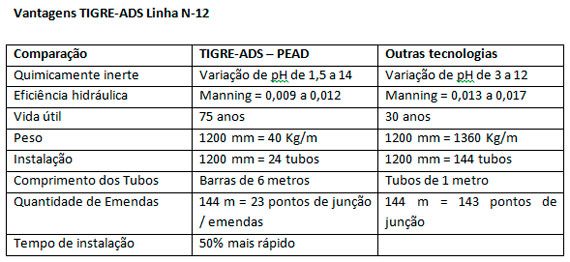 A linha N-12 WT (Water Tight) da TIGRE-ADS é composta por tubos com parede dupla, corrugada na parte exterior e lisa na parte interior. Seu sistema de união ponta e bolsa é feito por um encaixe, sendo a bolsa mais alargada.