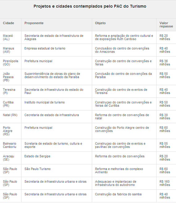 O decreto do programa foi publicado no Diário Oficial da União no dia 25 de junho. "O PAC do Turismo visa descentralizar o mercado de eventos, hoje ainda fortemente concentrado no eixo Rio-São Paulo", afirmou o ministério, em comunicado.