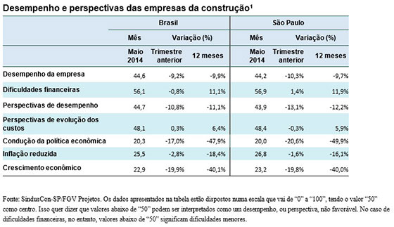 ...As perspectivas dos empresários da indústria da construção seguem pessimistas, de acordo com a 59ª Sondagem Nacional da Indústria da Construção Civil, realizada pelo SindusCon-SP e pela FGV. Em maio, a percepção dos empresários com relação ao desempenho atual de suas construtoras recuou 9,2% ante a pesquisa anterior e 9,9% em 12 meses.
