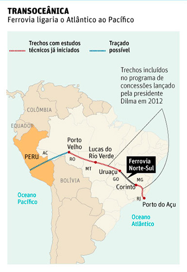 A cereja do bolo é a participação chinesa na chamada Ferrovia Transoceânica, que ligará a brasileira Ferrovia Norte-Sul à costa do Pacífico, no Peru. É um projeto de custo estimado entre US$ 4,5 bilhões (R$ 13,5 bilhões) e US$ 10 bilhões (R$ 30 bilhões).