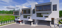 O projeto se beneficia do desnível do terreno para colocar as garagens sob as casas, sem a necessidade de se criar um subsolo inteiro. Com uma sala de estar ampla e integrada com a sala de jantar e cozinha, dois dormitórios e uma suíte, as residências proporcionaram um espaço amplo, iluminado, onde se mantém a privacidade de cada unidade. Um amplo terraço gourmet ao fundo da casa complementa a área de estar. A garagem no subsolo acomoda dois veículos, com um hobby box e área para cultivo ou jardim. A composição volumétrica cria uma unidade ao conjunto de três casas.