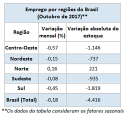 Das cinco regiões do Brasil, apenas a Norte teve alta (0,16%). Os demais estados tiveram perda de emprego: Nordeste (-0,15%), Sudeste (-0,08%) Sul (-0,45%) e Centro-Oeste (-0,57%).