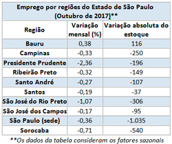 Na capital, que responde por 43,10% do total de empregos no setor, a queda em outubro relativo ao mês anterior foi de 0,36% (-1.035 vagas). Em 12 meses, São Paulo registra retração de 8,69% (-27.399 vagas).