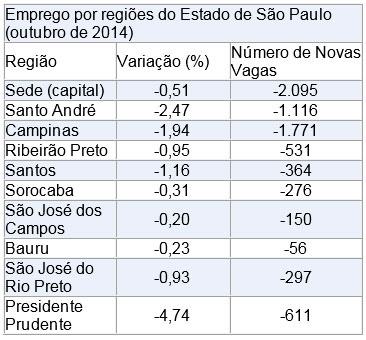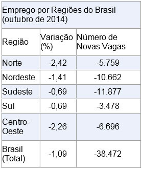 Entre janeiro e outubro de 2014, o índice apresenta alta de 0,15%, com a criação de 5,1 mil vagas. No mês, todas as cinco regiões do país apresentaram resultado negativo. Confira na planilha abaixo: