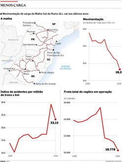 Enquanto isso, a movimentação na Malha Sul cai ano após ano. Segundo dados da ANTT, em 2006, a empresa fazia 28,942 milhões de Toneladas Úteis – total de carga transportada. Em 2016, esse número caiu para 18,345 milhões – queda de 36%.