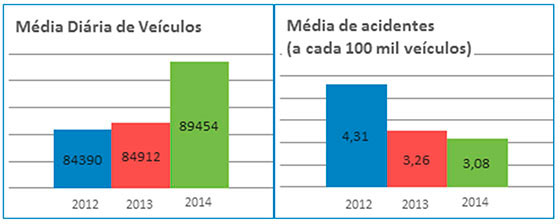 ...A Concessionária SPMAR, responsável pela administração do Trecho Sul do Rodoanel, comemora o fato da via ter registrado nos primeiro oito meses deste ano, um fluxo 5,35% maior do que no mesmo período de 2013(1), atendendo a uma média diária de 90 mil veículos (em dias de picos, este número supera os 105 mil). E, como destaque, em decorrência dos investimentos em manutenção e monitoramento realizados pela Concessionária, o Trecho Sul do Rodoanel vem apresentando constante redução nos índices de acidentes: de janeiro a agosto deste ano foram 3,08 acidentes a cada 100 mil veículos que passaram pela via, abaixo dos 3,26 de 2013 e dos 4,31 de 2012. Para a companhia, o resultado reforça o valor do Rodoanel como rota para aqueles veículos que não precisam passar pelo centro da região metropolitana de São Paulo, evidenciando que, cada vez mais, motoristas vêm percebendo as vantagens de utilizar este percurso.