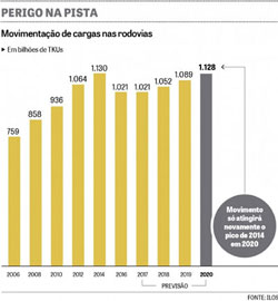 ...Mesmo sentindo uma retomada nos últimos meses, o transporte rodoviário de cargas só deve atingir o volume movimentado em 2014 daqui a pelo menos três anos. Em 2016, as empresas brasileiras gastaram R$ 361 bilhões com logística pelo modal, a primeira redução desde 2004.